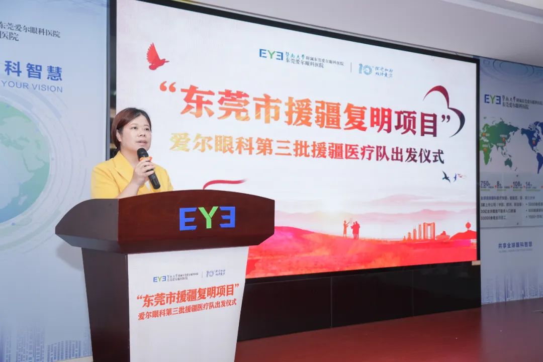 8月23日下午,“东莞市援疆复明项目”第三批援疆医疗团队出发仪式在东莞爱尔眼科医院举行。东城街道办事处副主任余伟红、东莞市卫生健康局医政医管科二级主任科员李旭棋、东城街道卫生健康局局长陈钧权、爱尔眼科东莞区域总院长刘斐、东莞爱尔眼科医院CEO程雪等领导出席出发仪式,东莞爱尔眼科医院护理部主任吴雁玲主持会议。