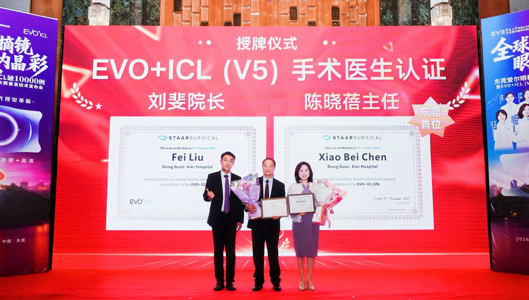 10000例的见证,是万千近视朋友对东莞爱尔眼科的信赖与托付;V5临床应用合作中心的落户,是为患者提供更优质、更精准高清视觉体验的全新起点。这双倍的荣誉是沉甸甸的认可,不仅是对我院屈光手术团队技术实力的权威肯定,更标志着东莞爱尔正式成为东莞首家且唯一一家获得EVO+ICL(V5)官方认证的医疗机构,与国际前沿晶体植入技术的接轨迈上了全新台阶。