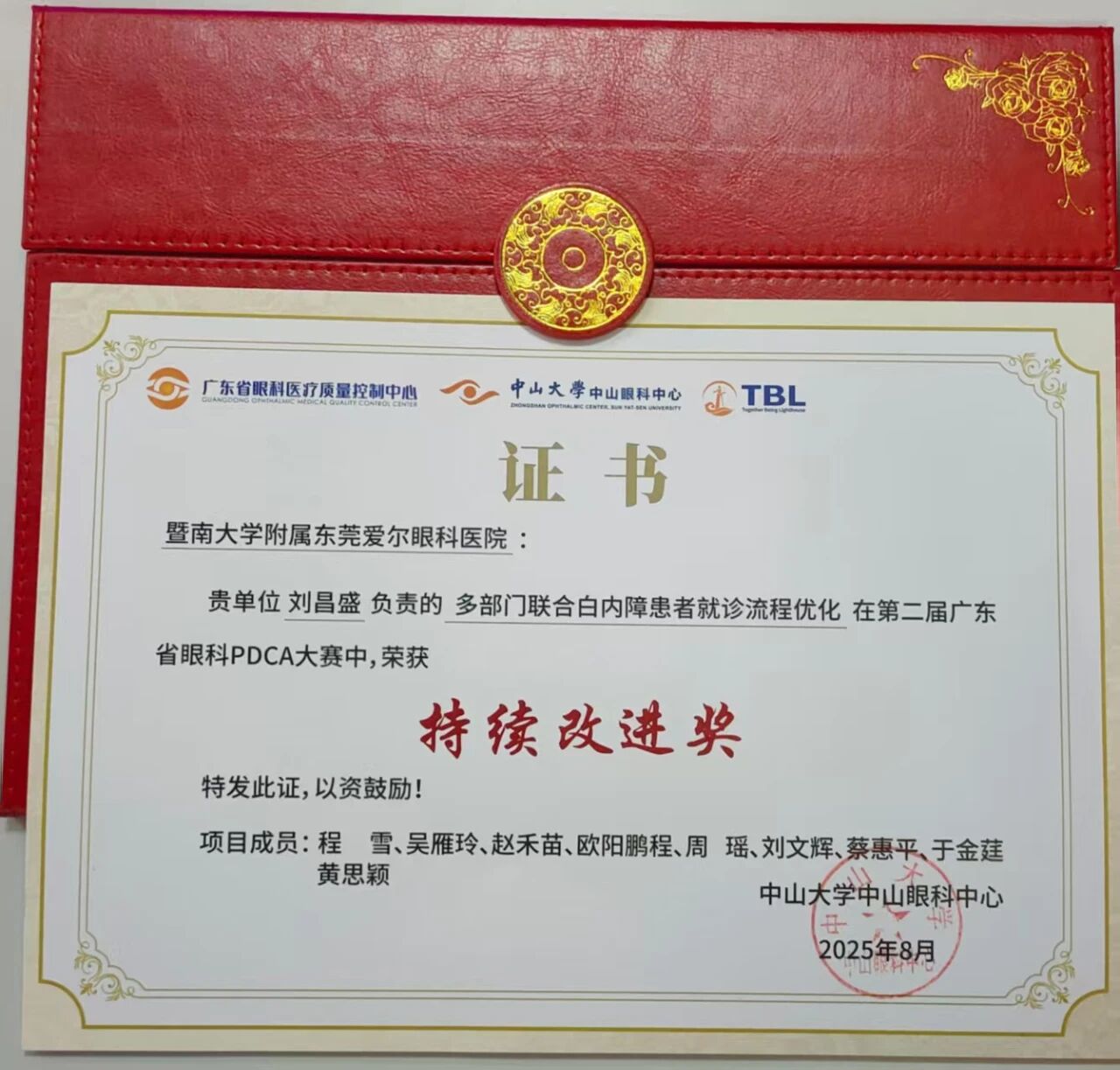 近年来,医院聚集眼科高质量发展,在大力引进高素质人才和先进医疗设备、持续开展新技术新业务的同时,注重管理团队建设和综合平台提升。此前,“睛莞圈”QCC团队因对白内障患者入院手术流程进行PDCA改进,荣获今年5月在广州举办的第二届广东省眼科PDCA大赛“持续改进奖”,并多次受邀参加省区及爱尔眼科集团医疗管理培训班进行案例分享,为更多业内同行提供案例参考。