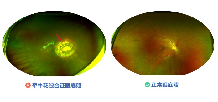 这是一种先天性的视盘(视神经在眼底的入口处)发育畸形。当医生给患者进行眼底检查时,会看到一个形态奇特、酷似盛开的牵牛花的视盘。正常的视盘呈淡粉色、边界清晰的圆盘状,而牵牛花综合征的视盘则明显扩大、凹陷加深,中心常伴有白色胶质组织,周围环绕着一圈放射状的血管和色素紊乱,宛如一朵花的瓣蕊。