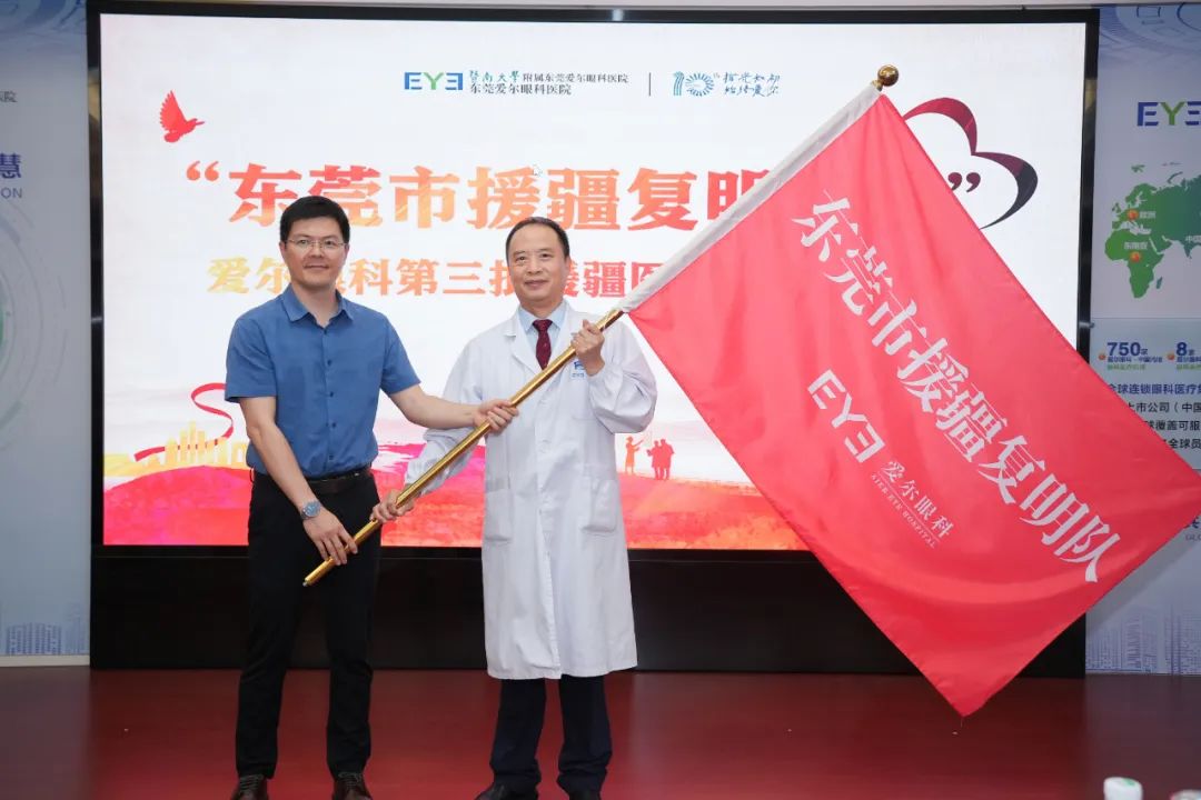 活动现场,东莞市卫生健康局医政医管科二级主任科员李旭棋为刘斐院长授项目队旗。接过队旗后,刘斐院长表示,我们将以高标准、高质量完成此次对口援疆工作,为师市眼科高质量发展输送“东莞智慧”、贡献“爱尔力量”。