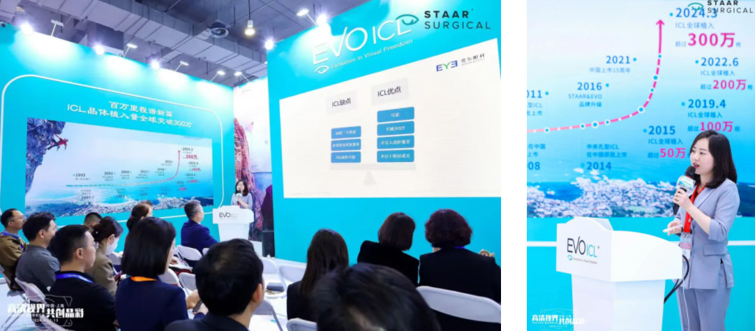 陈晓蓓主任在STAAR Surgical展台分享《中低度近视手术设计经验分享》课题,探讨ICL植入矫正中低度近视后的屈光效果及视觉质量的变化,其视觉质量优于术前戴镜,肯定了ICL对中、低度近视人群屈光矫正的手术安全性、有效性、稳定性及可预测性。