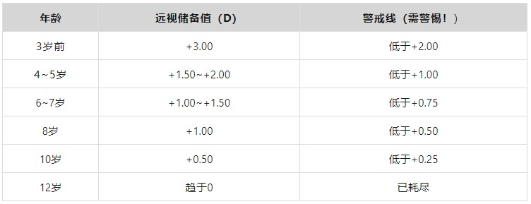 各年龄段远视储备参考值(划重点!)根据《中国学龄儿童眼球远视储专家共识(2022年)》,不同年龄的远视储备参考范围如下: