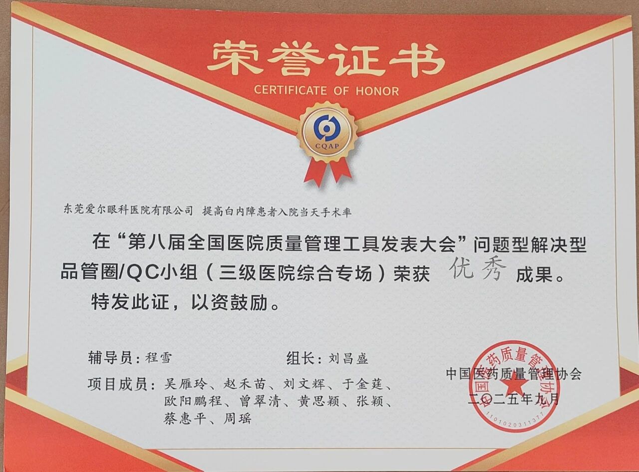 近年来,医院聚集眼科高质量发展,在大力引进高素质人才和先进医疗设备、持续开展新技术新业务的同时,注重管理团队建设和综合平台提升。此前,“睛莞圈”QCC团队因对白内障患者入院手术流程进行PDCA改进,荣获今年5月在广州举办的第二届广东省眼科PDCA大赛“持续改进奖”,并多次受邀参加省区及爱尔眼科集团医疗管理培训班进行案例分享,为更多业内同行提供案例参考。