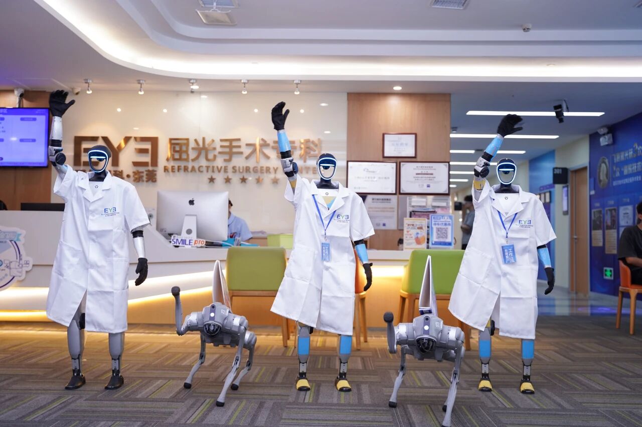 发布会现场不仅是技术展示台,更是科技体验场。宇树科技的机器人与机械狗化身 “导诊员”,亮相东莞爱尔眼科医院及活动现场,凭借先进的运动控制算法完成导诊、路径指引等任务,直观感受“医疗 + 机器人”融合创新。