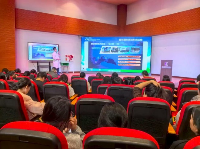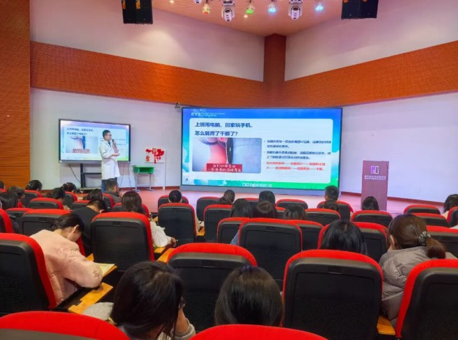 受聘仪式后,黄河华医生以新任“健康副校长”身份,为全体教师开展了一场专业眼健康科普讲座。作为东莞爱尔眼科医院眼底外伤科医生,黄河华医生从教师群体的工作场景出发,重点讲解了高度近视的潜在风险与干眼症的日常防护。