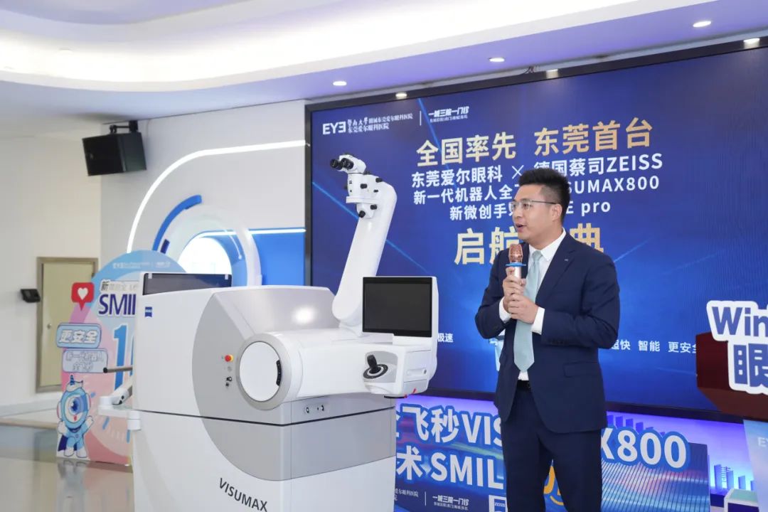蔡司公司代表王木生先生对新一代机器人全飞秒VISUMAX800的启用表示祝贺。他介绍,该设备以其高颜值、高设计、极速和双导航等特点,为患者营造了良好的手术环境,同时解决了医生在手术中矫正中心和散光方面的难题。他相信,在陈晓蓓主任的带领下,东莞爱尔眼科医院将为更多近视患者带来福音。